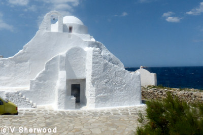 The shuttle bus dropped us at the east end of town and we walked along the shore to downtown Mykonos. We were struck by this church with a red roof; most had white or blue roofs so this one really stood out. |