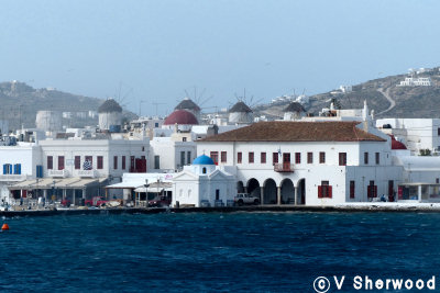 Downtown Mykonos with a pretty little church right on the harbour and the famous windmills above the town. The church is Agios Nikolakis or St. Nicolaus, the patron saint of sailors and fishermen. The church was originally on a small island which was built into the harbour. |
