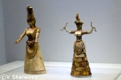 Statuettes of priestesses. The one on the right is holding a snake in each hand. | ![]() |