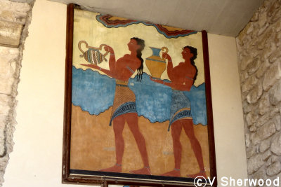 A fresco of servants carrying jugs. Another famous fresco, the Youth with Lilies, is on my Crete 1998 page. The fresco in the Archaeological Museum in Heraklion did not have the lilies (see below). | ![]() |