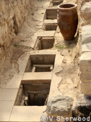 There are huge storage areas called magazines at Knossos. Grain was probably stored in the rectangular pits and olive oil and wine in jars. At the peak of the Minoan civilization, the palace complex and surrounding city had a population of about 100,000 people, which would require large stores of food. |